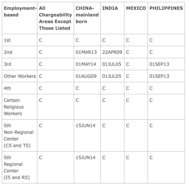 表B,递交申请日(DFA)的截止日,2014年6月15日,继续维持开放。接下来,还是得看USCIS(移民局)的态度,在一周之内USCIS将公布,他们是按照表A或表B,来接受I-485(在美国调整身份)的申请。
